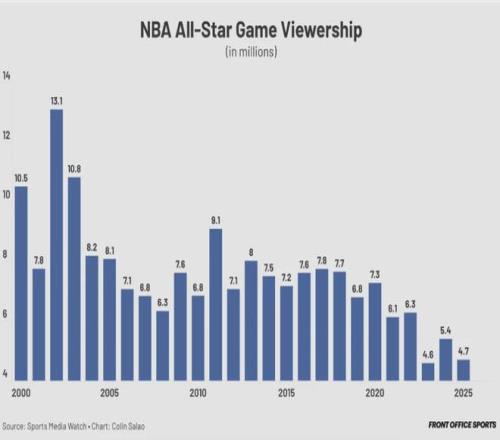 全明星为什么要改革?看看下面这张图你就知道了。2025年NBA全明星正赛,在TNT的平均观众人数仅有470万,比2024年下降13%。这是NBA史上收视率第二低的全明星,仅高于2023年的460万。跟20年前相比,差不多少了一倍。