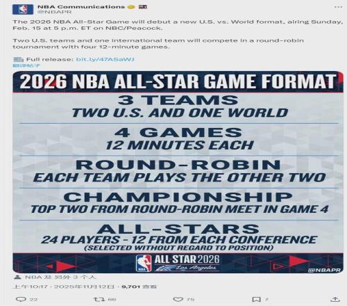 北京时间11月12日上午10点17分,NBA官方宣布,2026年全明星改革:正式启用美国队VS世界队的全新赛制!详细规则:1、2支美国队和1支世界队进行循环赛;2、合计打4场比赛,每场12分钟;3、一共24位全明星,每队8人。