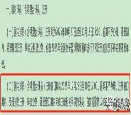 国内球员(含港澳台球员)注册窗口期为2025年12月28日至30日17:00,逾期不予办理。注册窗口期内,受理球员注册、转会业务。注册窗口期内完成注册相关手续的球员,自常规赛第12轮起具备上场资格。