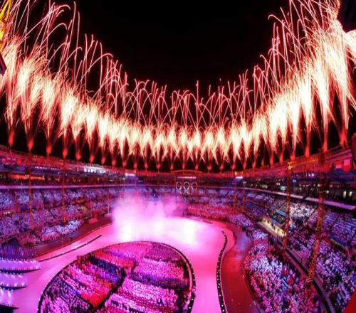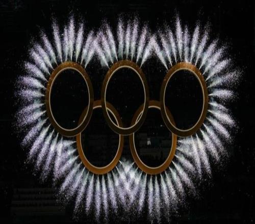 奥运五环周围绽放出绚丽的烟花。