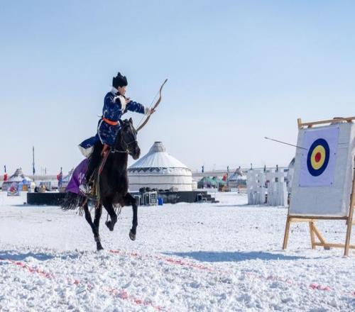 2026年2月1日,内蒙古锡林郭勒,第三届冬季蒙古马超级联赛总决赛点热寒冬。选手们参加15公里耐力赛、跑马射箭、跑马拾哈达等五项冰雪赛事。视觉中国 图