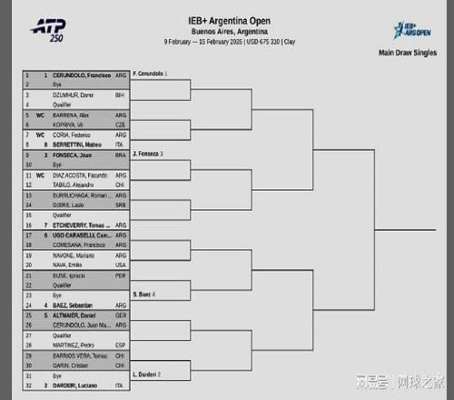 ATP250阿根廷布宜诺斯艾利斯站:本土名将F-塞伦多罗、意大利人达尔德里位列前两号种子,卫冕冠军是巴西新星丰塞卡。