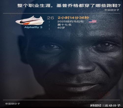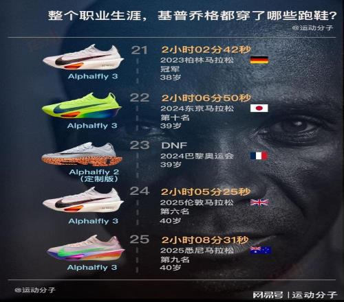 28岁到38岁这十年,基普乔格保持着惊人的83.3%出战夺冠率,自己成为马拉松GOAT的同时,Vaporfly Elite、Vaporfly NEXT%、Vaporfly 2、Alphafly NEXT%、Alphafly 2、Alphafly 3这些战靴,无一例外配享跑鞋的万神殿。