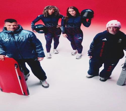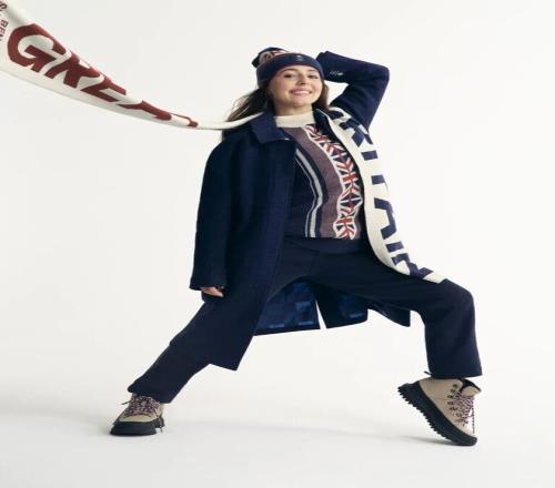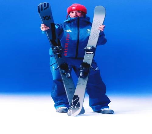 Adidas 负责竞技装备与功能结构,将英国国旗 Union Jack 图案进行结构性解构,使其融入冬季运动服廓形之中,而非简单的平面印花。色块拼接与几何切割让视觉更具速度感,也强化了竞技氛围。