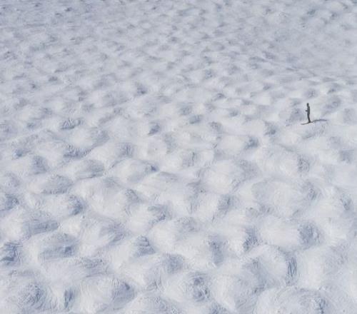 高级雪道地形复杂,坡度较大,通常没有压雪车专门整理,只要一场大雪遇上一群人,规律便产生了:大家习惯在相似的位置转弯,雪板则不断将积雪推向外侧。随着时间的推移,小雪包汇聚隆起成小山丘,最终在坡面上刻画出凹凸相间的槽状地形。在漫长的冬季里,蘑菇经历着日复一日的自然演变——夜晚冻结定型,午后被阳光晒软,或是被新雪覆盖后由后来者重新“雕琢”。如果不加人工干预和整理,整座雪山最终都会被这股力量占领。