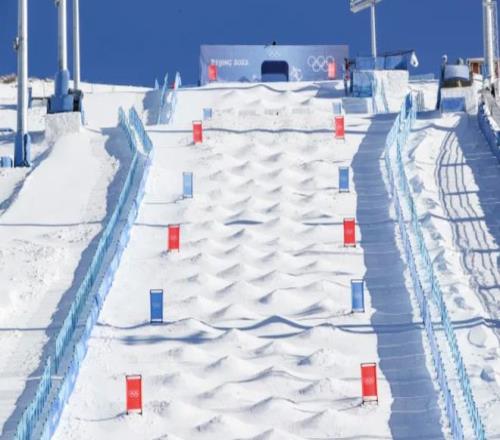 赛道长度被严格规定不能少于250米(普通国际赛事范围通常在235米±35米),平均坡度要维持在28°±4°,斜面上均匀分布着密集的雪包, 雪包之间的中心距离通常设定在3.5米至4米之间,这个距离是根据顶尖选手的滑行速度(男选手约11-12米/秒,女选手约10米/秒)计算出来的。除了连贯的雪包,赛道还嵌入了两个关键的空中动作跳台。第一个跳台位于赛道总长约15%处,第二个则设在离终点约20%处。|奥运会官网