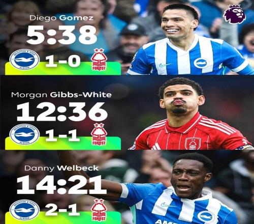 进球大战,布莱顿和森林前15分钟轰入3球,为本赛季英超首次 -